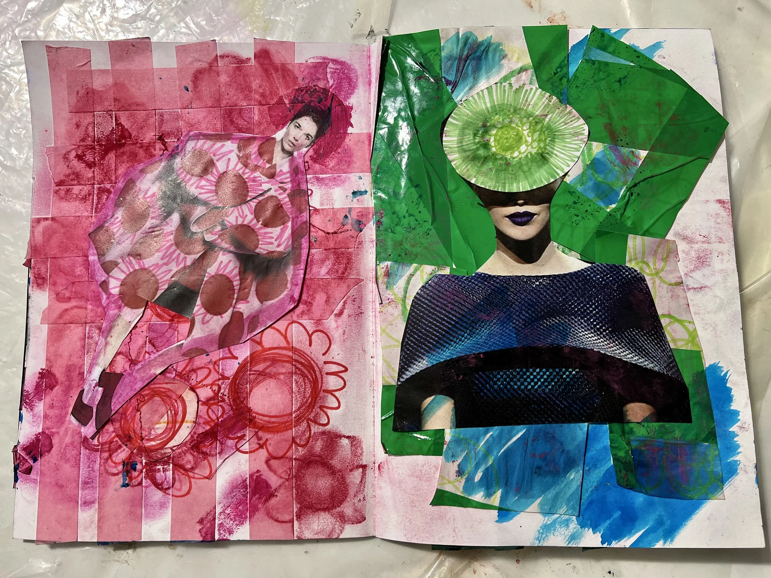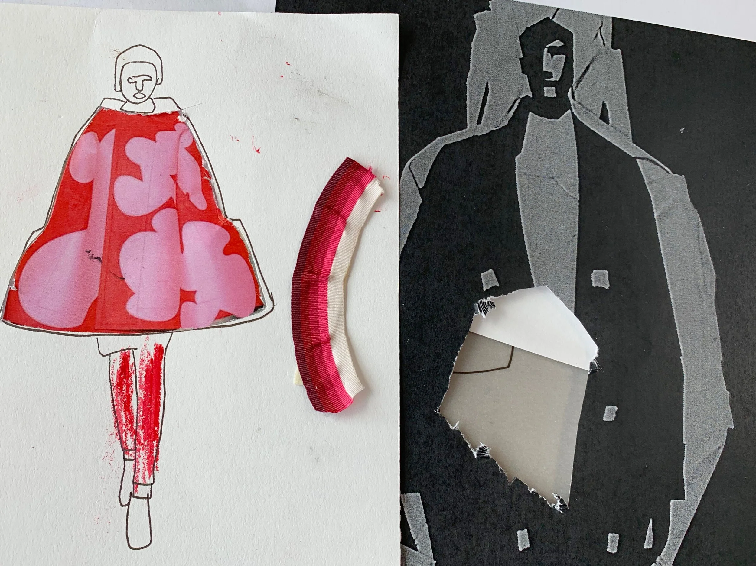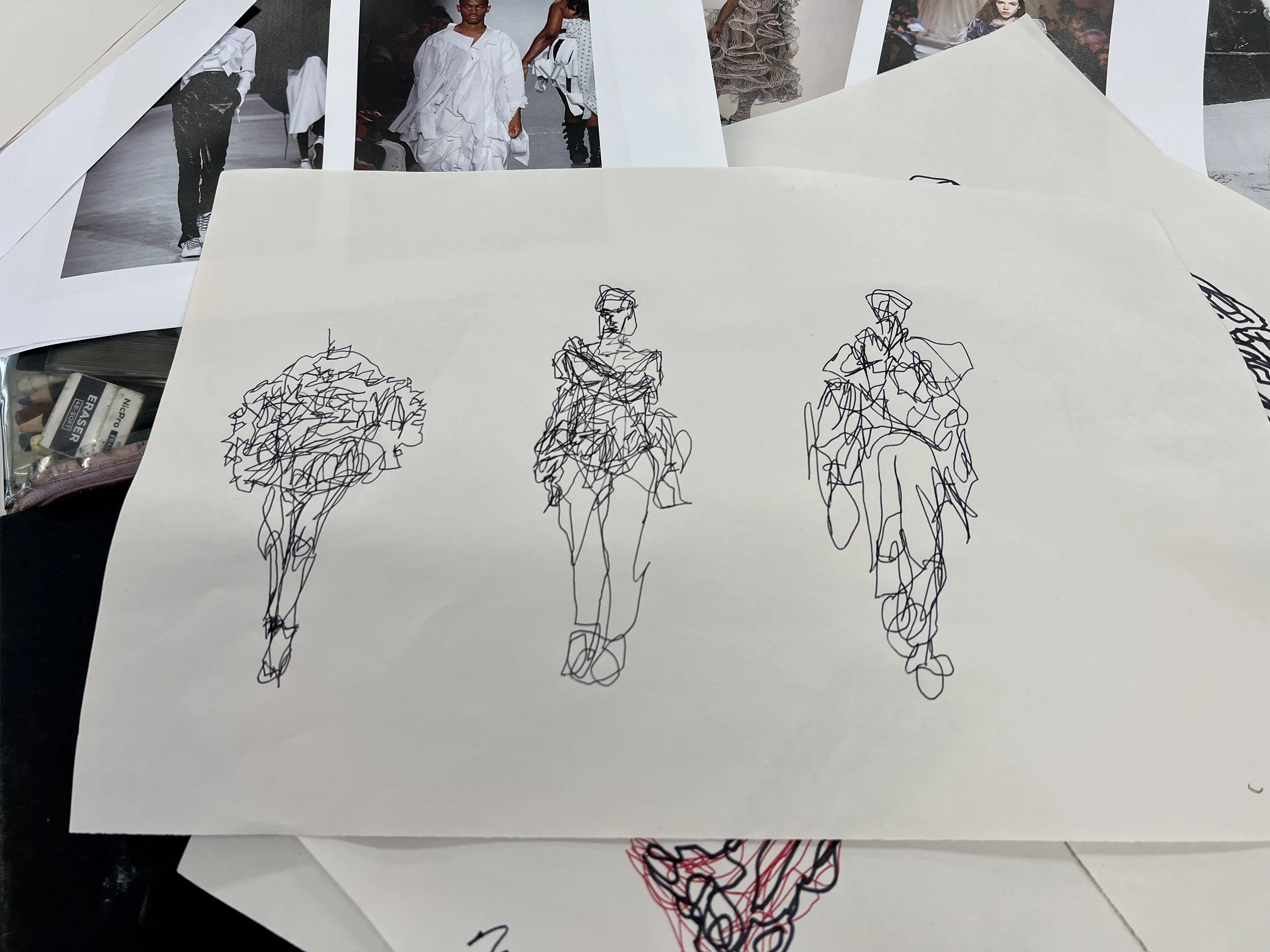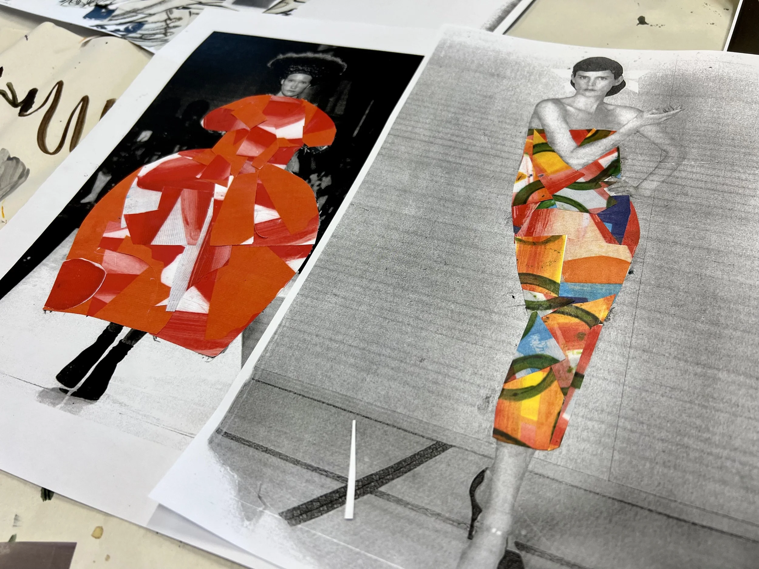 In the fashion illustration workshop we will explore a rage of fast paste and expressive drawing processes using colour, shape, pattern and mark-making techniques. These outcomes will be used to form the illustration designs using; collage, intercutting, print and stitch. We will use old scrap pieces of work and waste materials to embellish your illustrations, integrating sustainability. By the end of the session you will have a collection of abstract illustrations for your sketchbooks, mood-boards and portfolios. This workshop will help with confidence in drawing and encourage creativity within design.