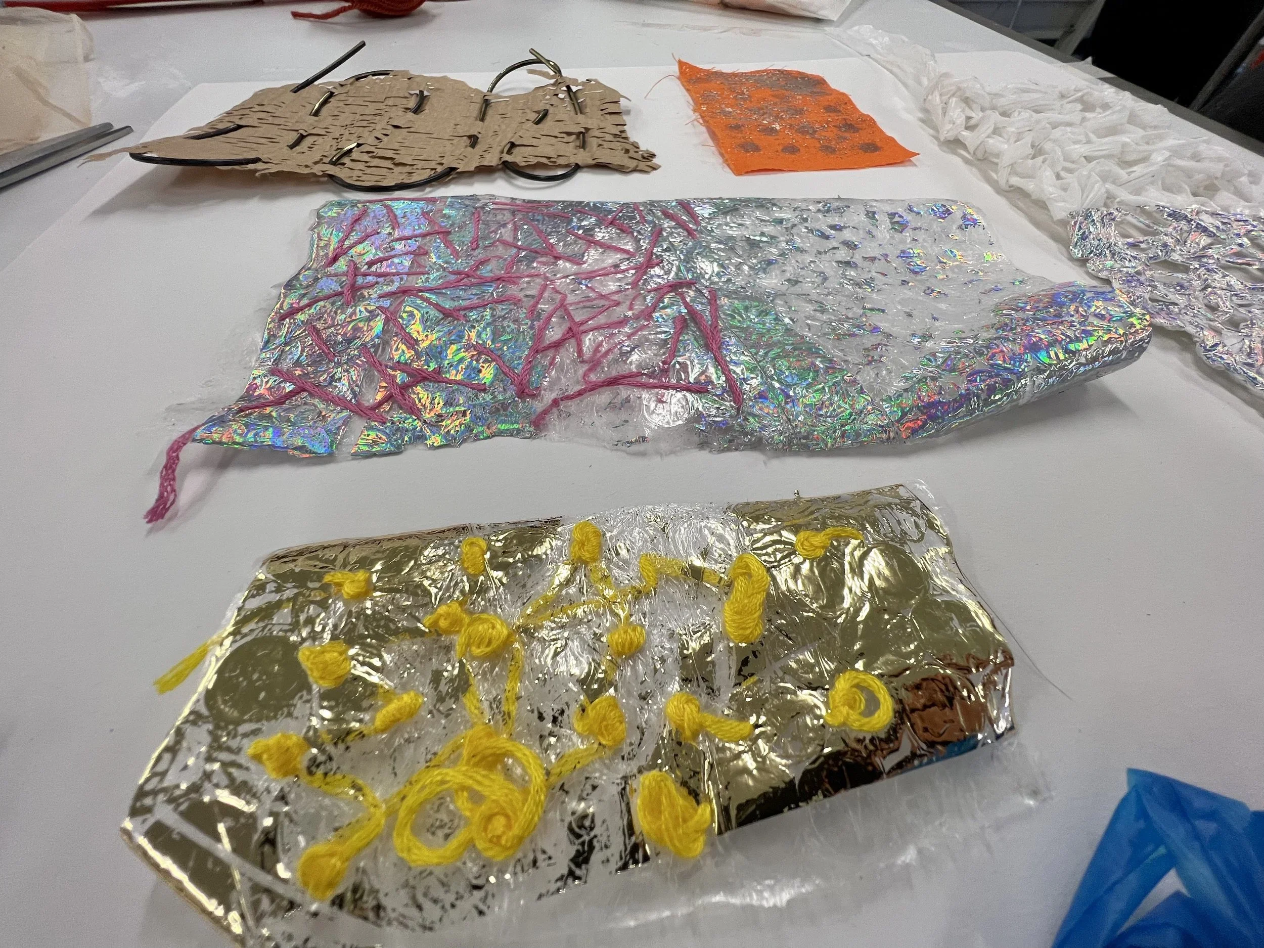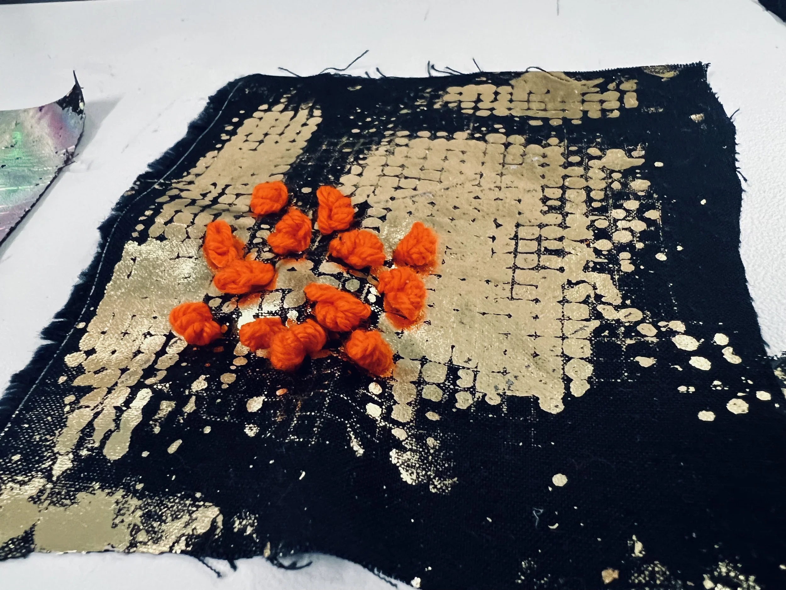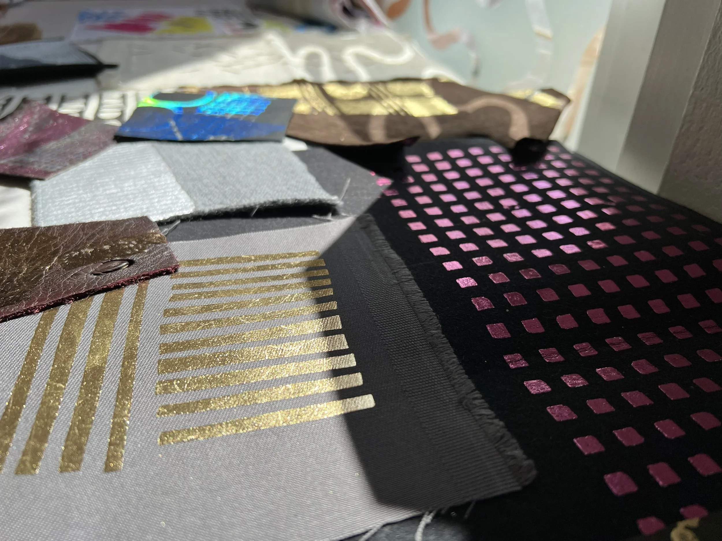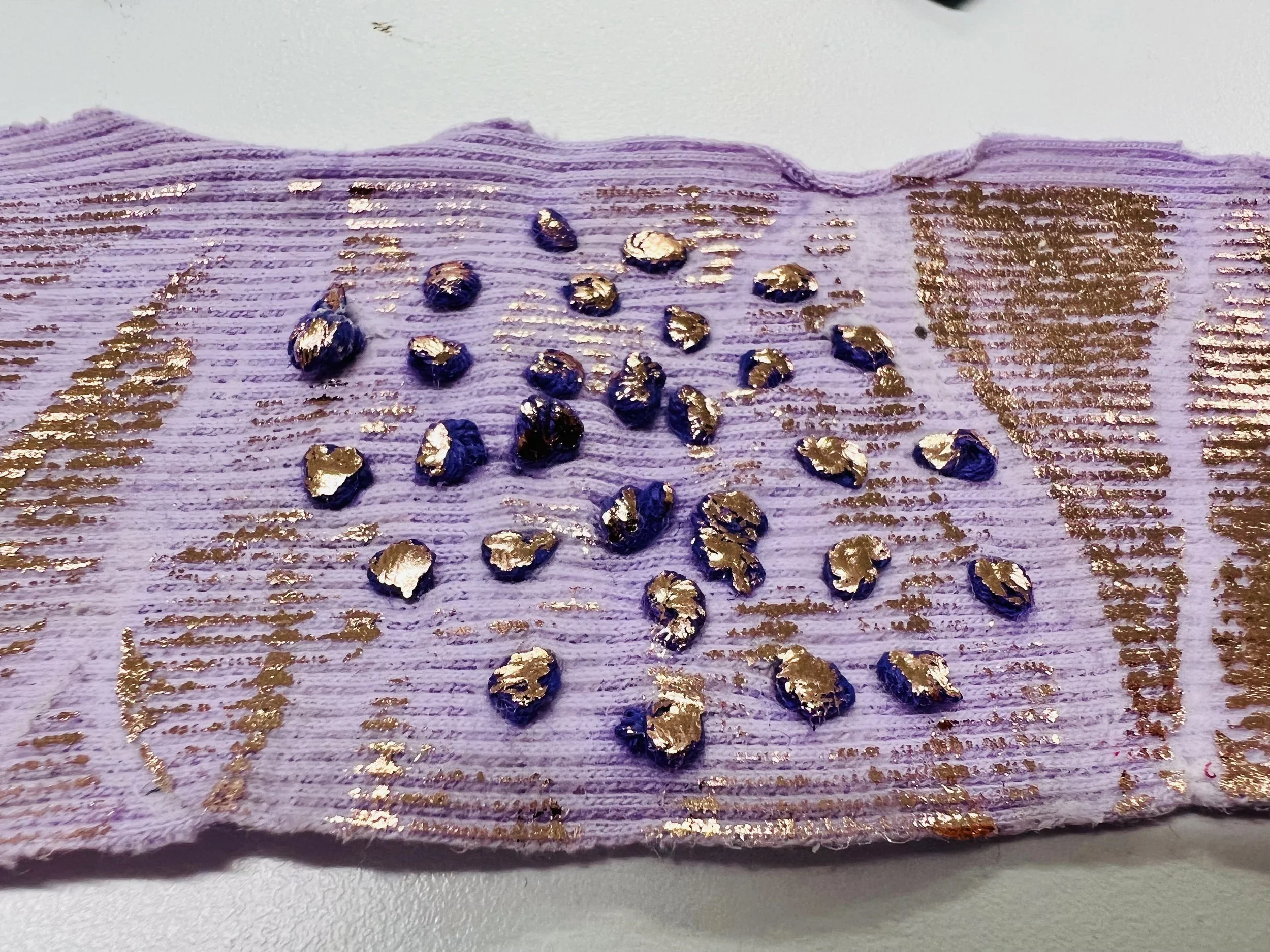 Foiling is a process that leaves the surface shiny, experimenting with hand painting and screen printing to create designs. Foil adhesive is used during this process to transfer the foils onto the material, leaving the design with a metallic finish. Printers are guided through the full process of designing, printing, and foiling their own samples and final pieces. The technique can be applied to a wide range of textured surfaces, including knit, weave, stitch, crochet, leather, cotton, and linen. This process also works on other printed surfaces, such as screen print or a sublimation print design, layering multiple techniques onto one material. All materials will be provided in this workshop, and participants are encouraged to explore any materials they may have at home or sourced from a charity shop for printing during the session.