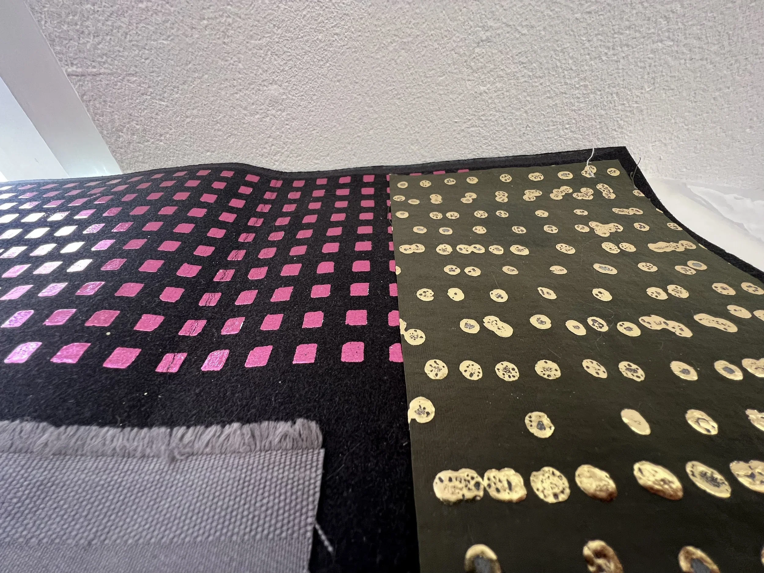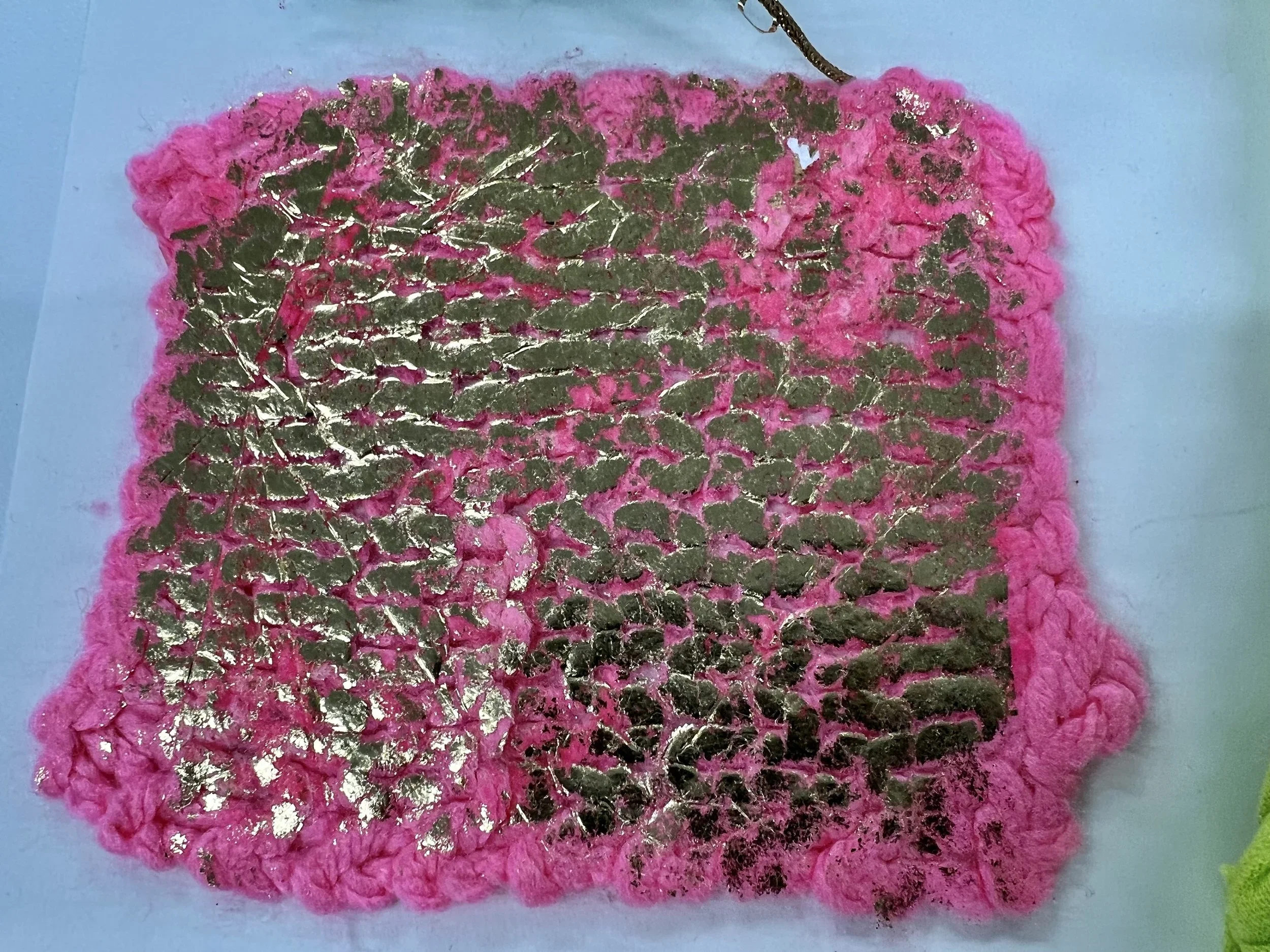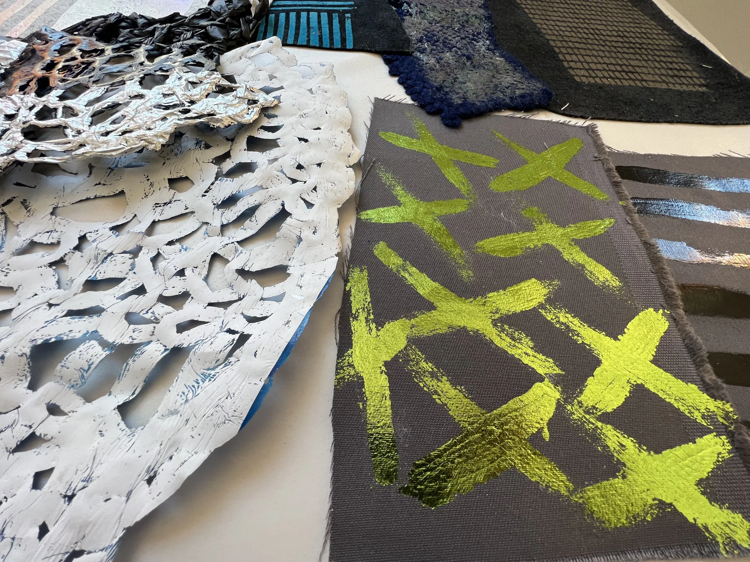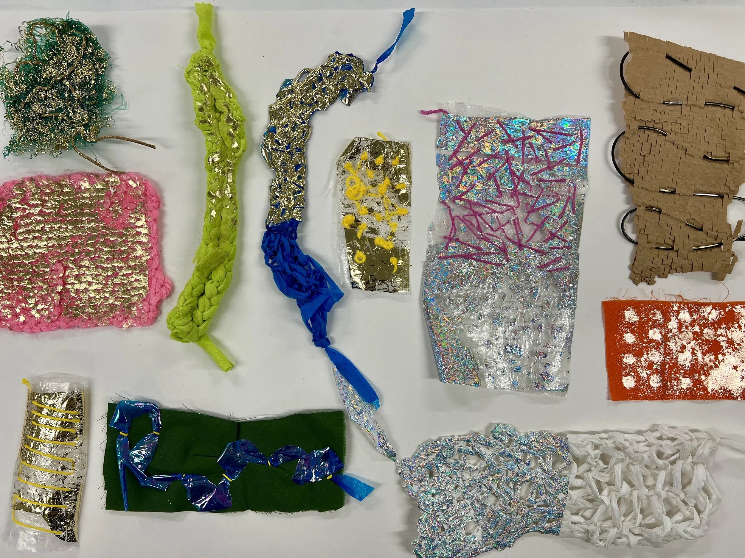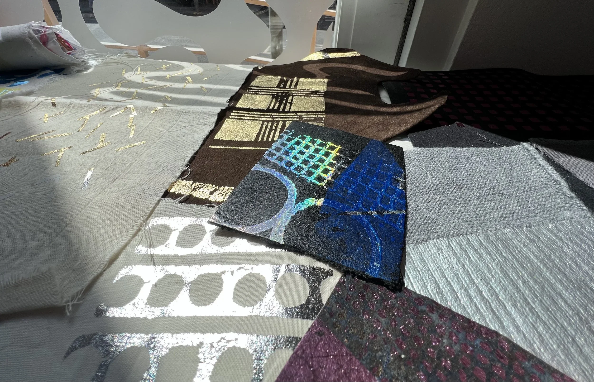 Foiling is a process that leaves the surface shiny, experimenting with hand painting and screen printing to create designs. Foil adhesive is used during this process to transfer the foils onto the material, leaving the design with a metallic finish. Printers are guided through the full process of designing, printing, and foiling their own samples and final pieces. The technique can be applied to a wide range of textured surfaces, including knit, weave, stitch, crochet, leather, cotton, and linen. This process also works on other printed surfaces, such as screen print or a sublimation print design, layering multiple techniques onto one material. All materials will be provided in this workshop, and participants are encouraged to explore any materials they may have at home or sourced from a charity shop for printing during the session.