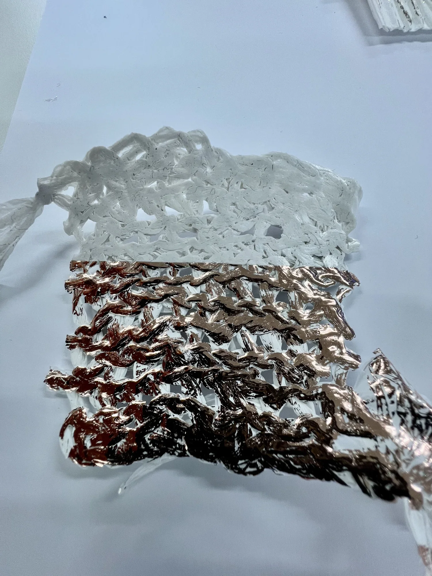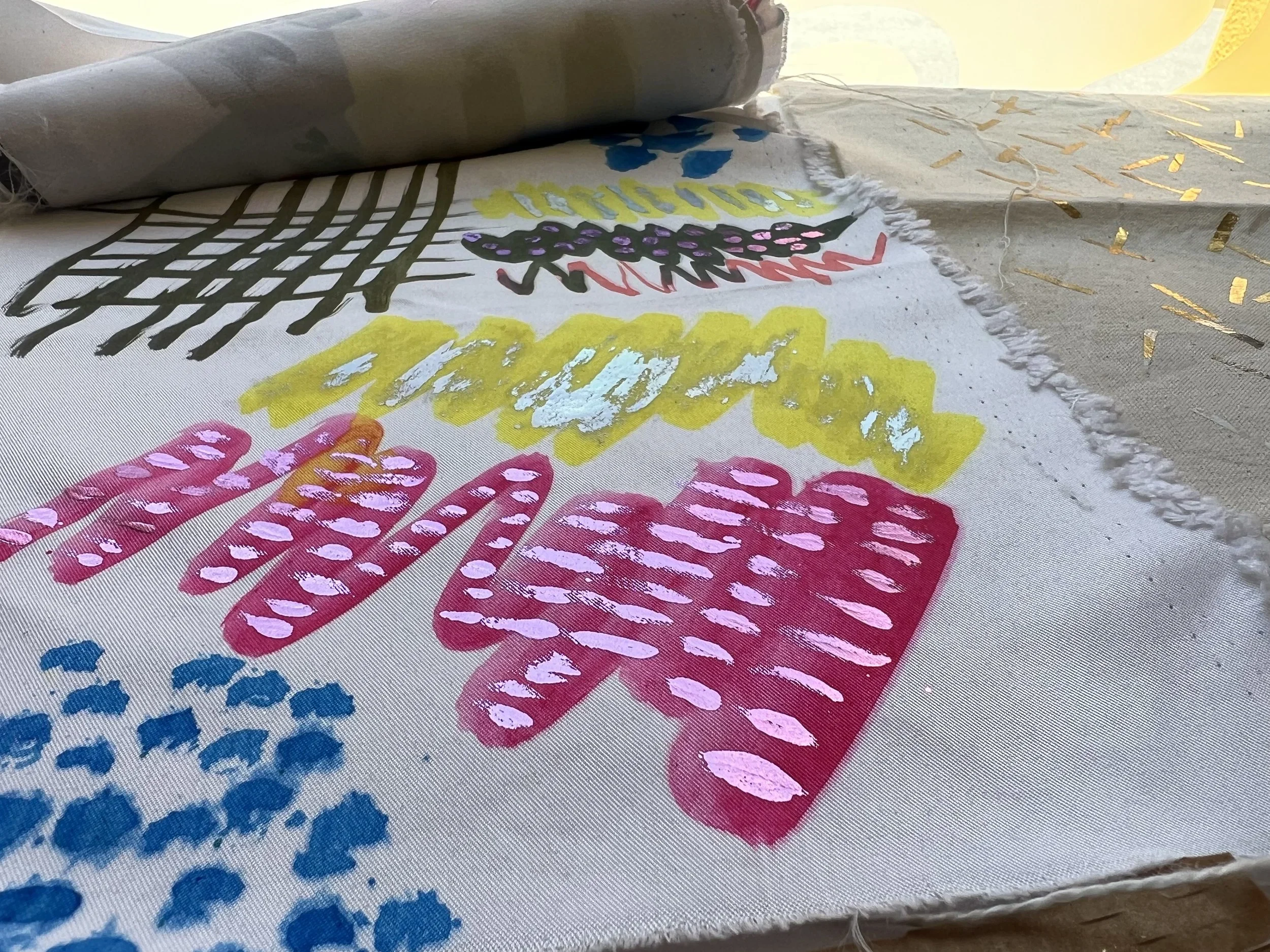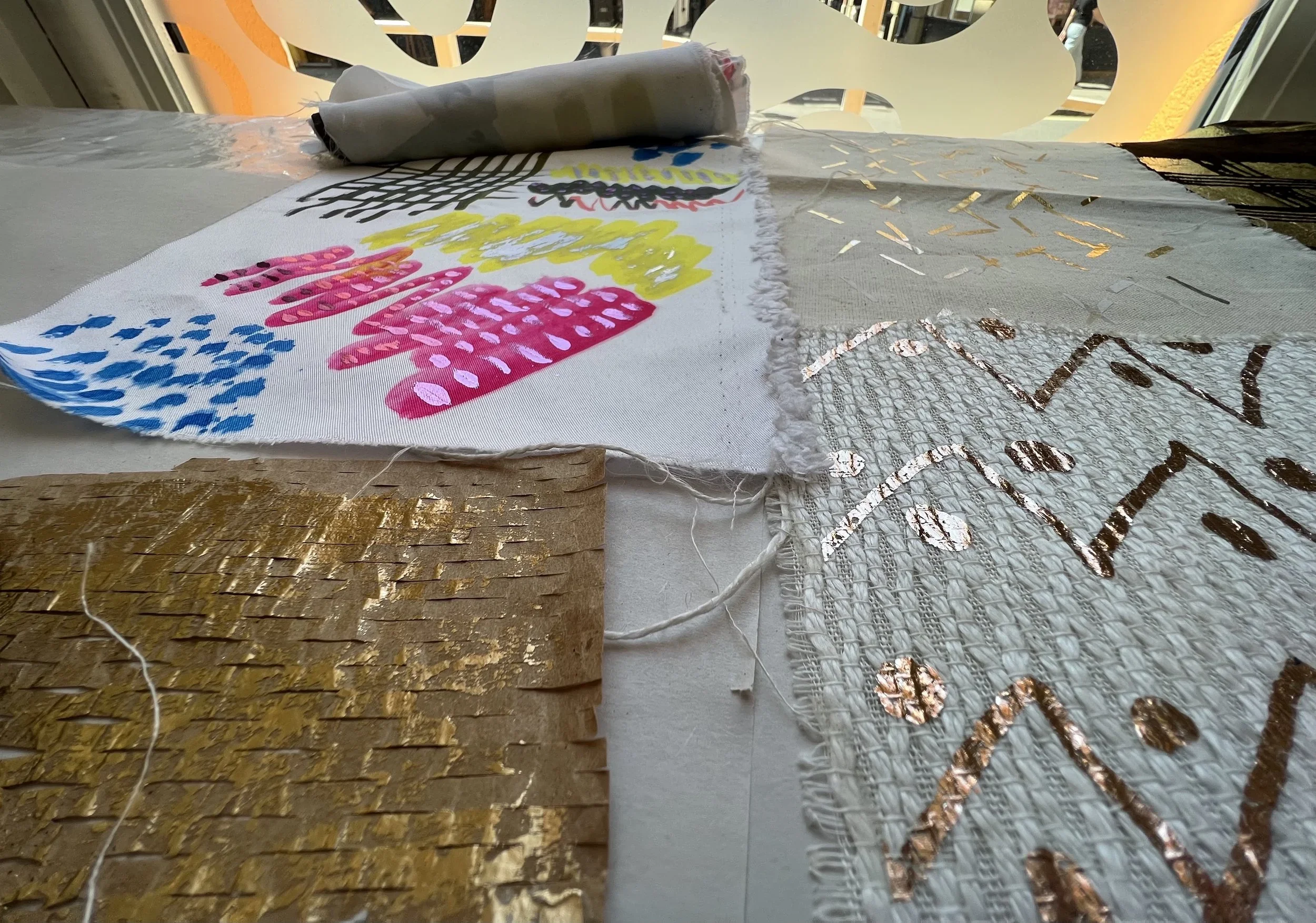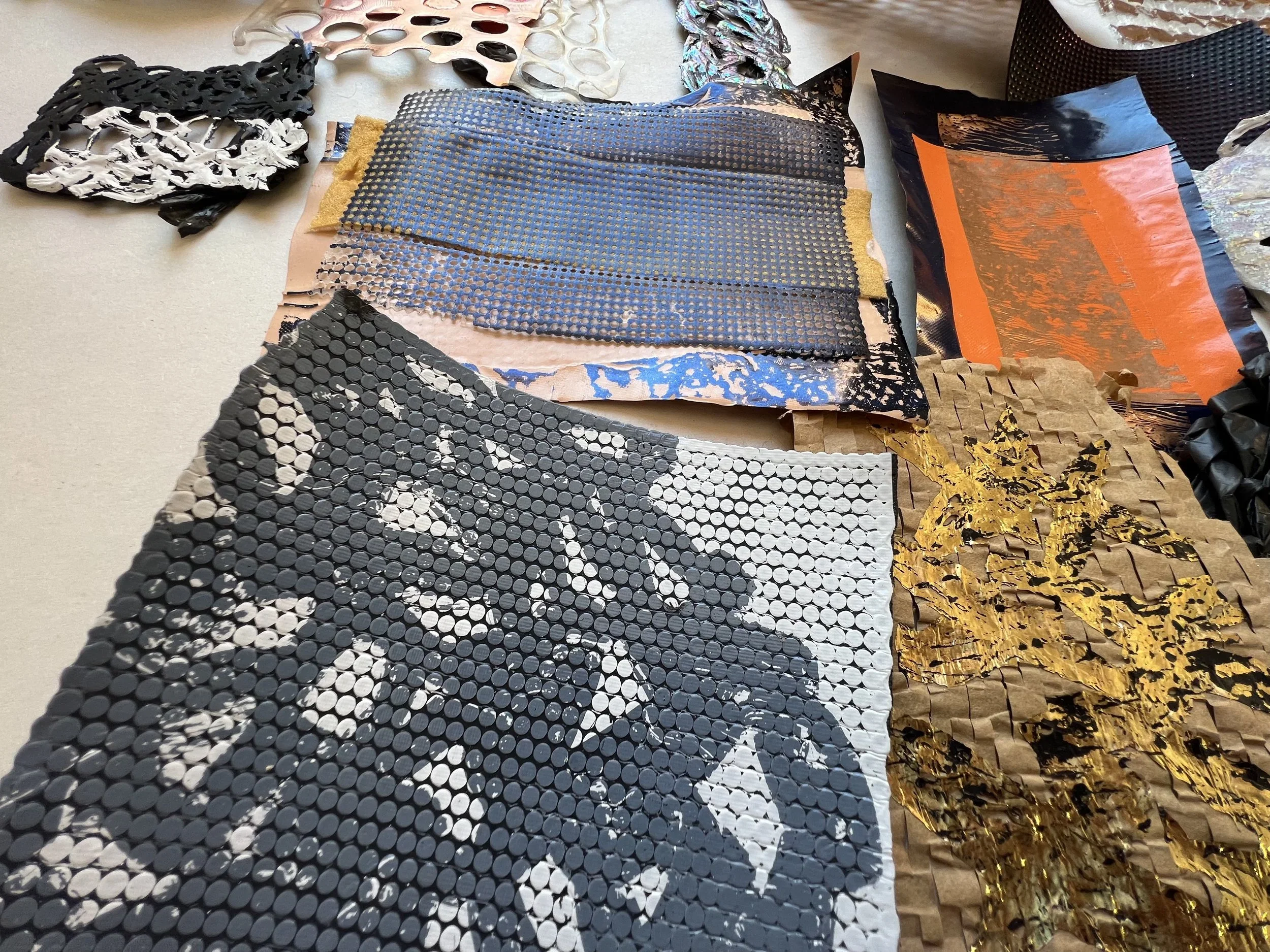 Foiling is a process that leaves the surface shiny, experimenting with hand painting and screen printing to create designs. Foil adhesive is used during this process to transfer the foils onto the material, leaving the design with a metallic finish. Printers are guided through the full process of designing, printing, and foiling their own samples and final pieces. The technique can be applied to a wide range of textured surfaces, including knit, weave, stitch, crochet, leather, cotton, and linen. This process also works on other printed surfaces, such as screen print or a sublimation print design, layering multiple techniques onto one material. All materials will be provided in this workshop, and participants are encouraged to explore any materials they may have at home or sourced from a charity shop for printing during the session.