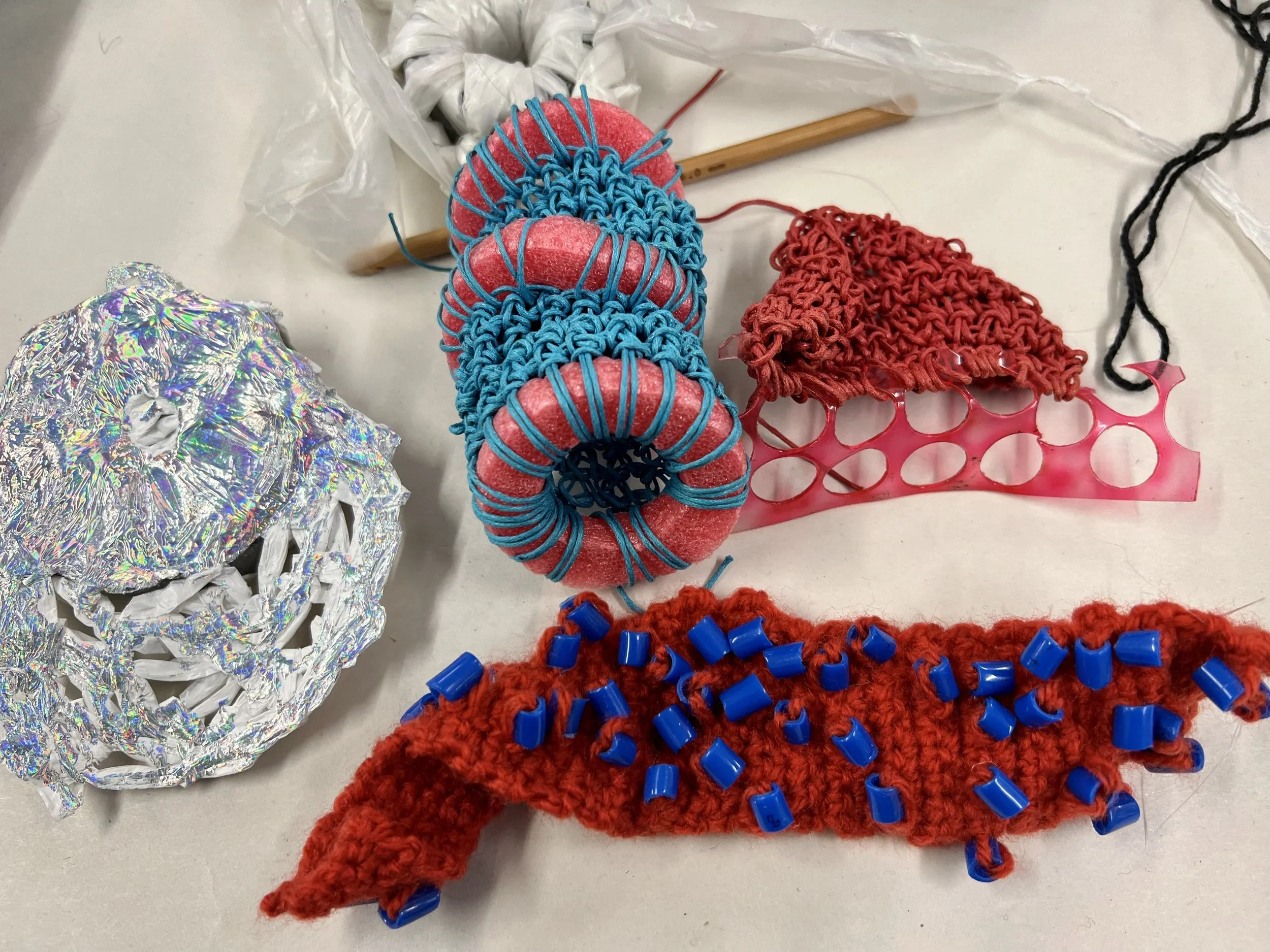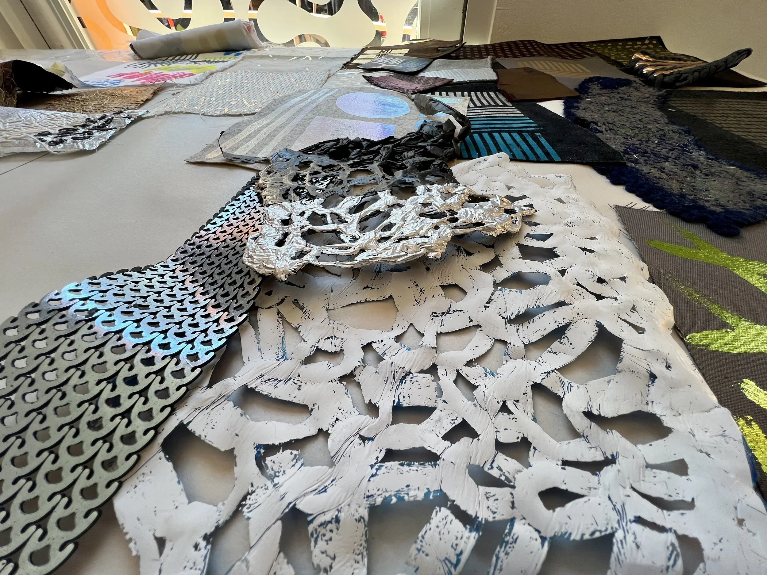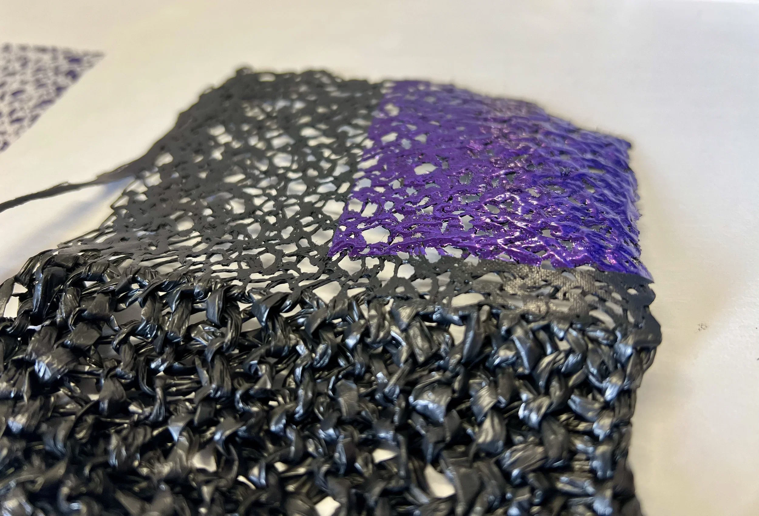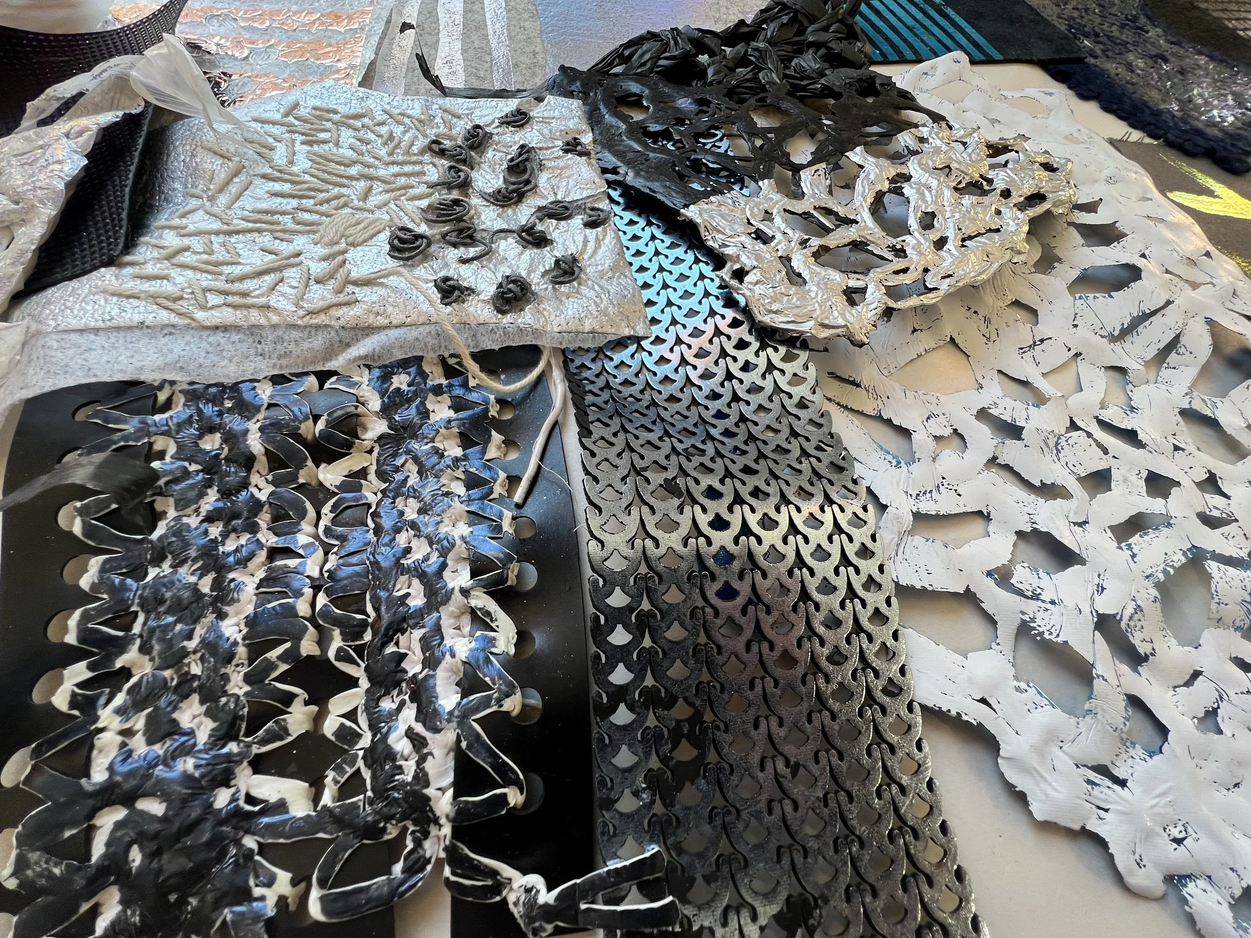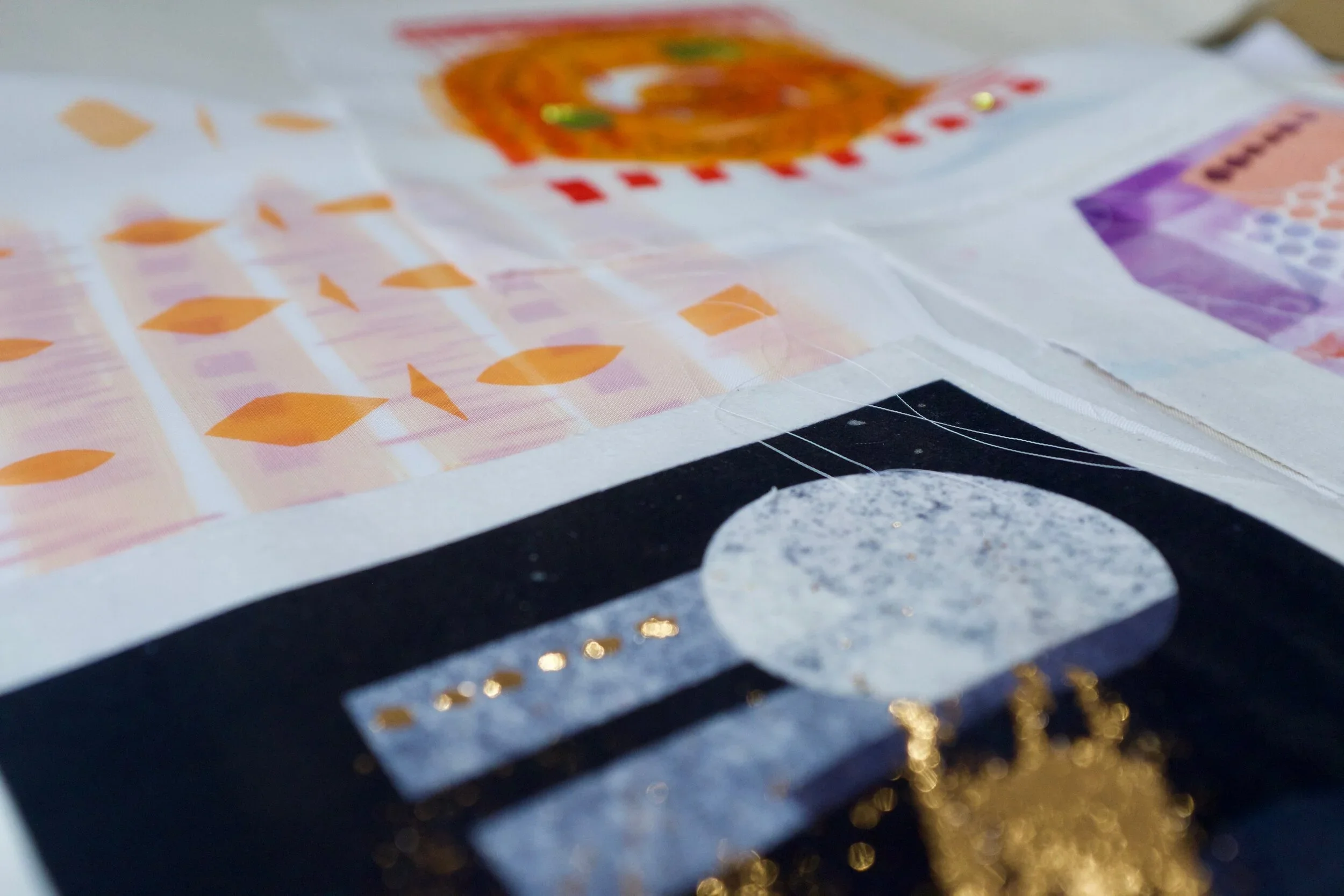 Foiling is a process that leaves the surface shiny, experimenting with hand painting and screen printing to create designs. Foil adhesive is used during this process to transfer the foils onto the material, leaving the design with a metallic finish. Printers are guided through the full process of designing, printing, and foiling their own samples and final pieces. The technique can be applied to a wide range of textured surfaces, including knit, weave, stitch, crochet, leather, cotton, and linen. This process also works on other printed surfaces, such as screen print or a sublimation print design, layering multiple techniques onto one material. All materials will be provided in this workshop, and participants are encouraged to explore any materials they may have at home or sourced from a charity shop for printing during the session.